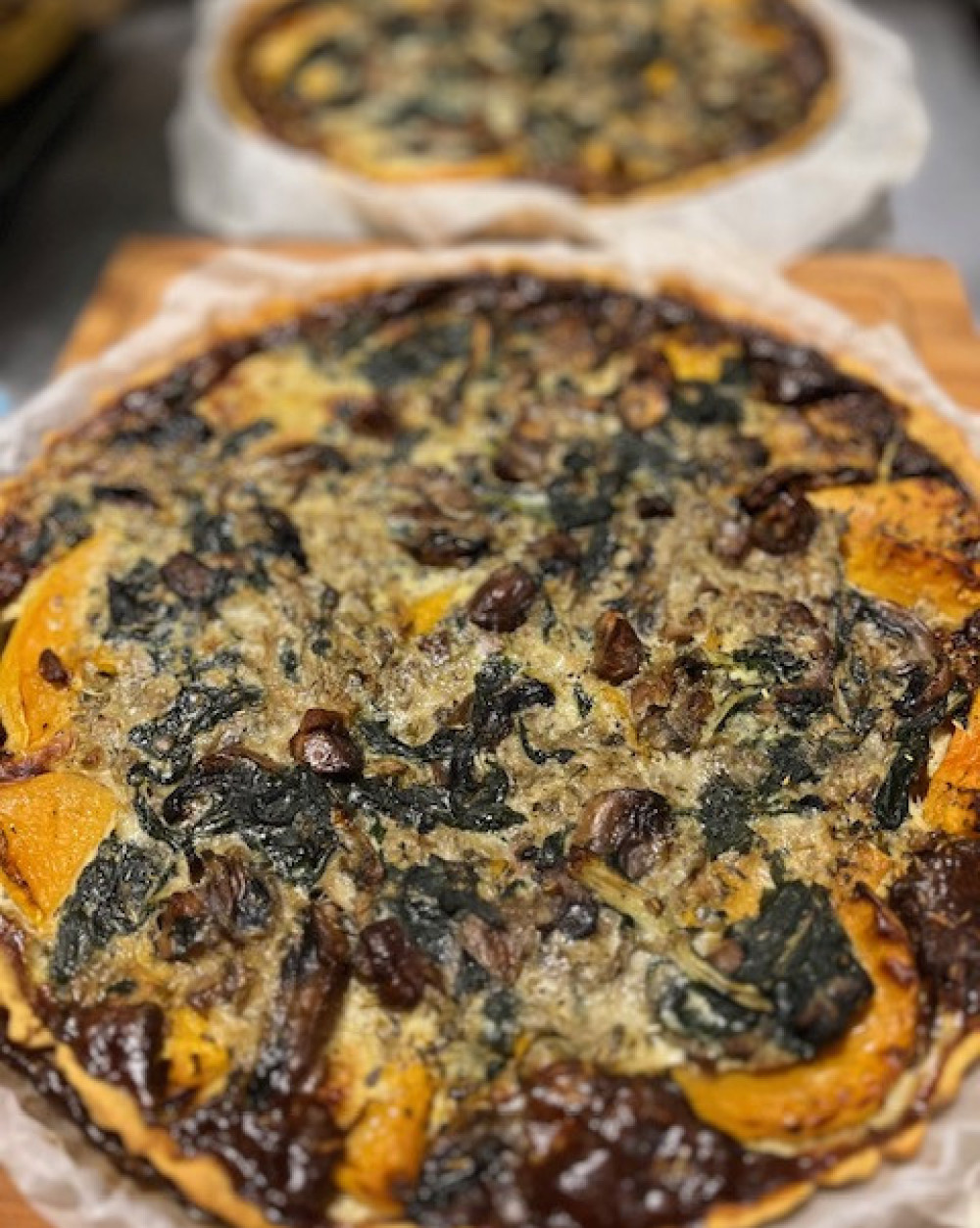 Ingrédients : Farine de pois chiche, fécule de pomme de terre, huile oliveoeuf, crème de riz, blettes, oignons, butternut, fromage de chèvre.