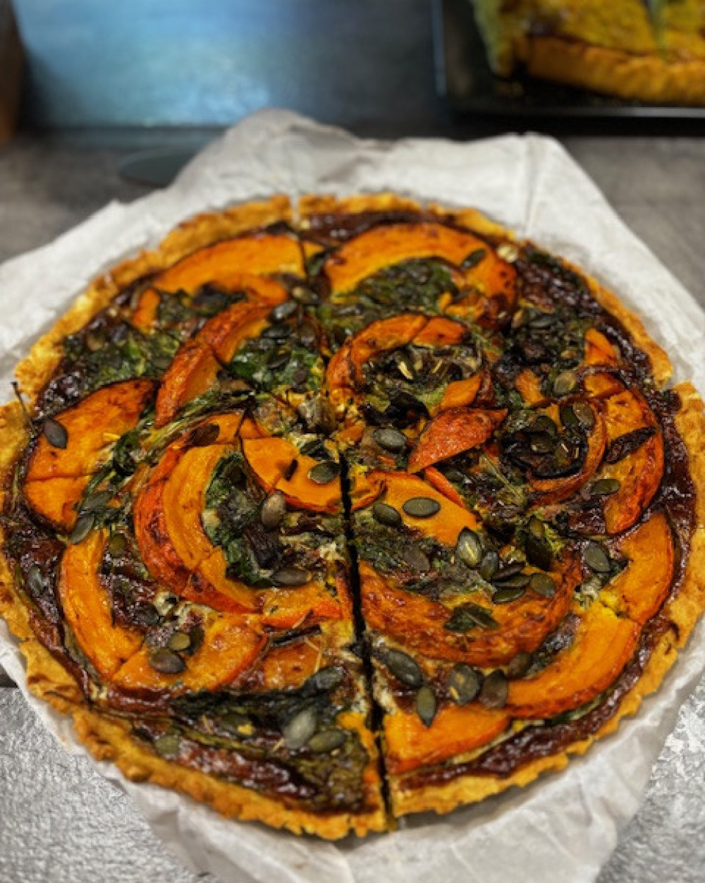Ingrédients : Farine de pois chiche, fécule de pomme de terre, huile olive, crème de riz, oeufs, aromates, butternut oignons confits, fromage de chèvre,